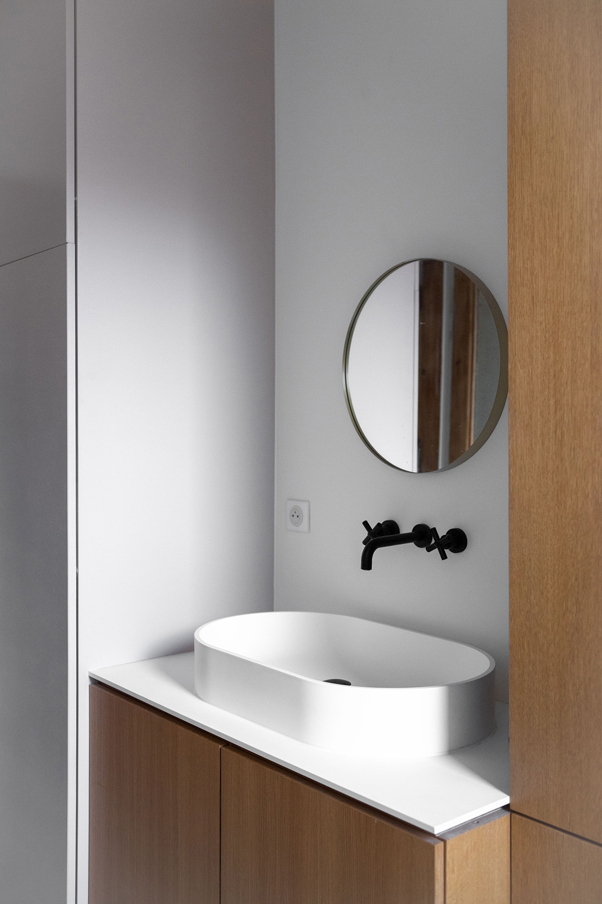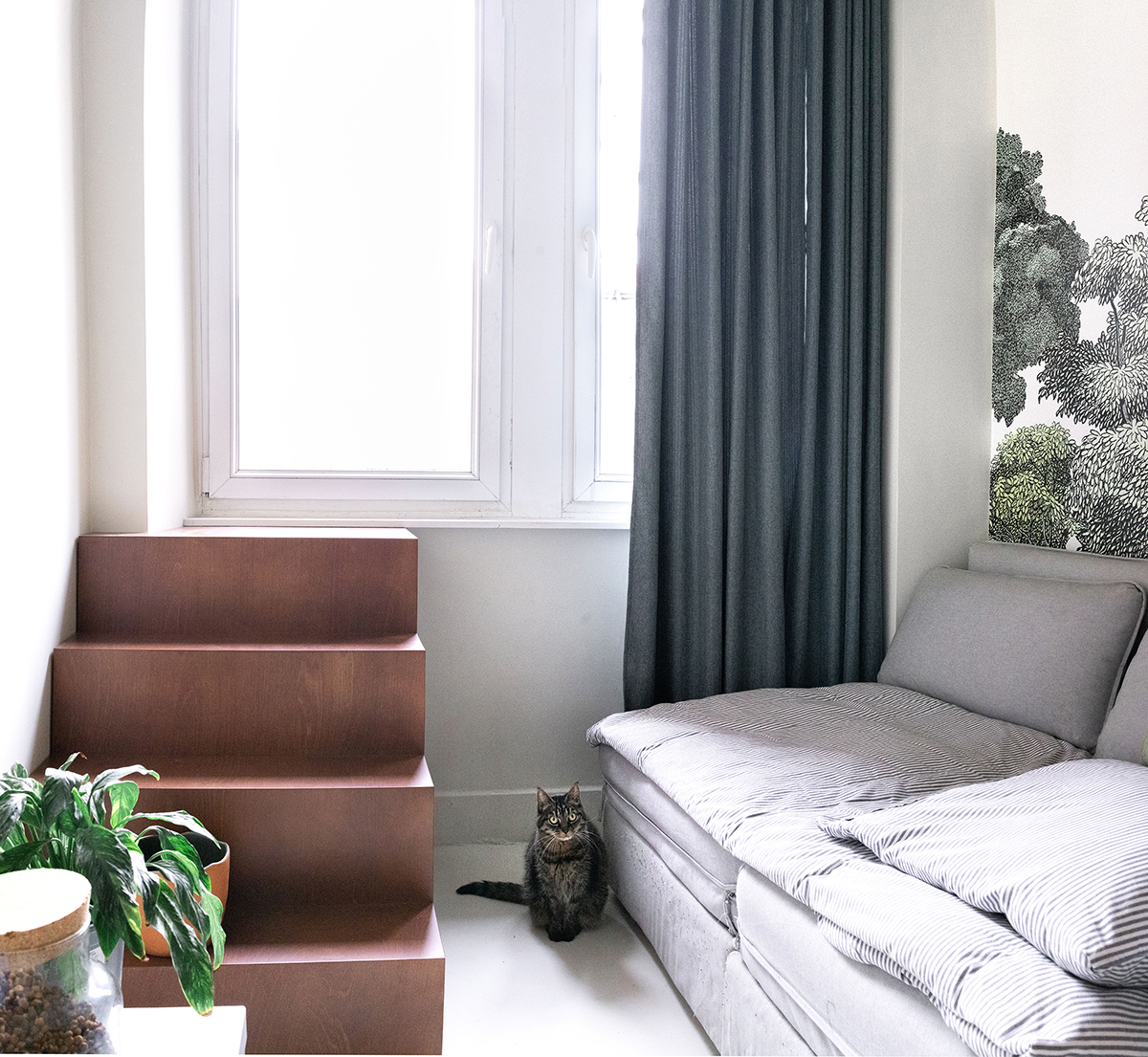 Situé dans le quartier de la laiterie à Strasbourg, cet appartement Haussmannien à totalement été restructuré et renové. L’enjeux pour ce rez de chaussé sur-élevé à été de revoir totalement la distribution de l’appartement afin de passer d’un T2 sans espace extérieur à un T3 avec terrasse. La décoration et les œuvres d’art ont été choisies avec soin par le studio afin de parfaire le projet.